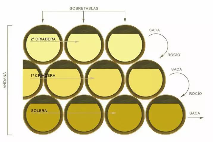 自Solera層抽取1/3的酒液(法律規(guī)定,每年抽取量不得超過Solera層酒液量的1/3)裝瓶,隨后自其上一層(第一培養(yǎng)層1a criaderas)抽取1/3酒液注入Solera層,同理,第一培養(yǎng)層內(nèi)則注入第二培養(yǎng)層(2a criaderas)1/3的酒液……直至每個酒桶都經(jīng)歷一次抽取并補入酒液的過程(最上層的Sobretabla層空余部分需用同批次酒液填滿)。