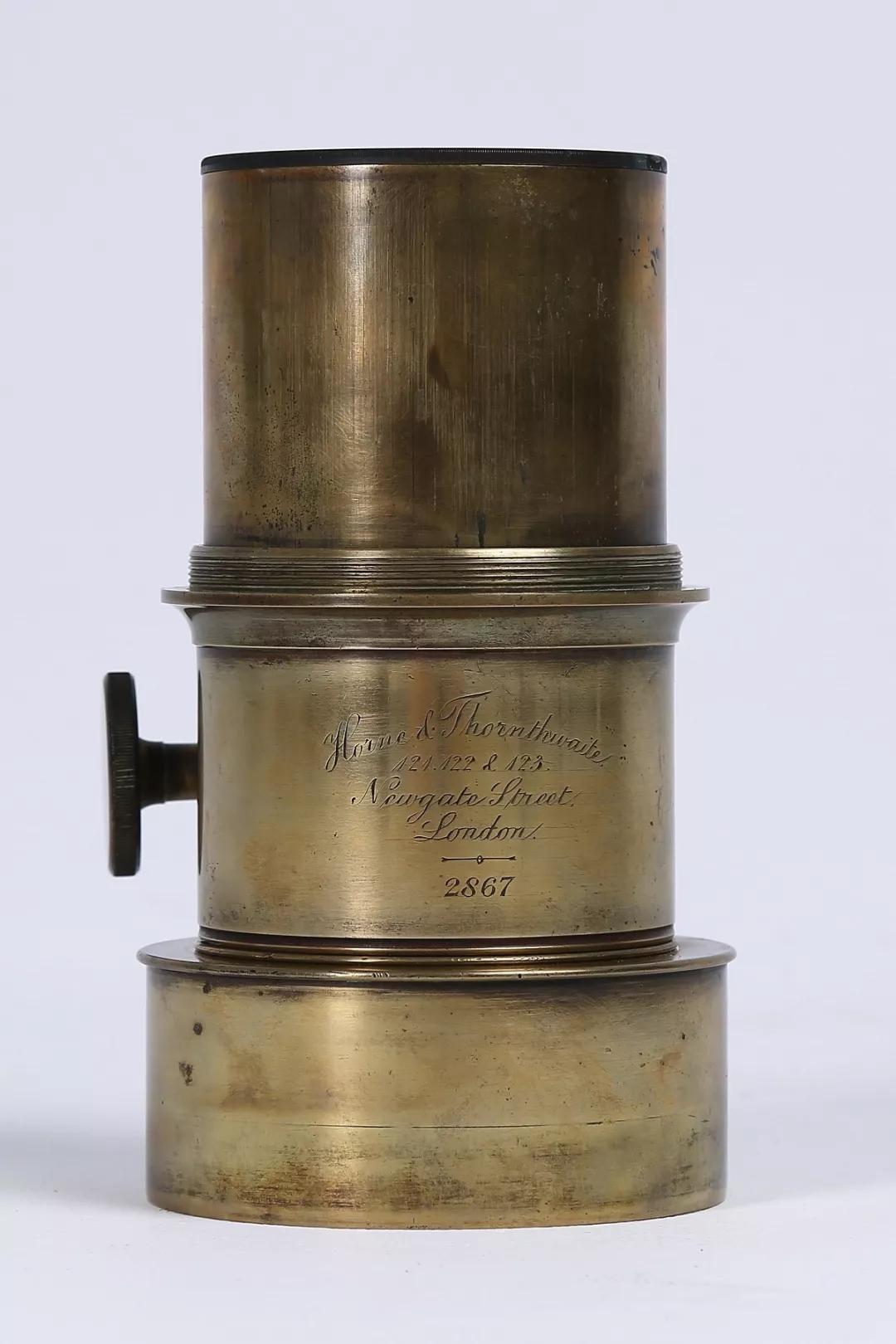 相機片夾(匣)缺失。鏡頭為匹茲伐(Petzval)250mm F4.5 人像鏡頭(圖 06),鏡頭編號:2867,由英國霍恩公司于 1841 年至 1842 年制造。這只鏡頭由黃銅制成,又大又重,側面有個旋鈕用來調焦(圖 07)。