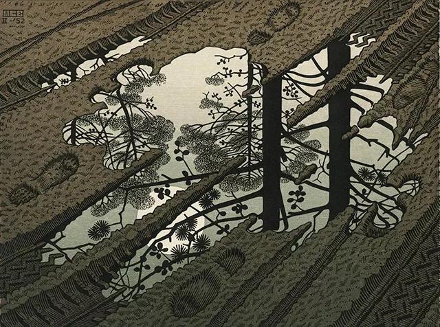 這張作品描繪的場景看似平淡無奇:車轍、鞋印、水坑,但倒映出來的卻是一個完全超自然的世界。日常景物與超現(xiàn)實倒影景物相互呼應(yīng),極富內(nèi)涵。