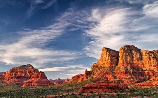 如上圖,夕陽的余暉,把山體染成了鮮艷的橙紅色,與大片的藍(lán)色天空和綠色樹林形成了鮮明的色彩、冷暖對比,十分富有韻味。