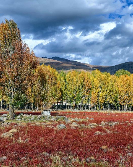 村落、河流、樺樹、青稞田、寺院,這里就是一幅旖旎的田園山水畫。每年9、10月,金燦燦的樹一列排開。