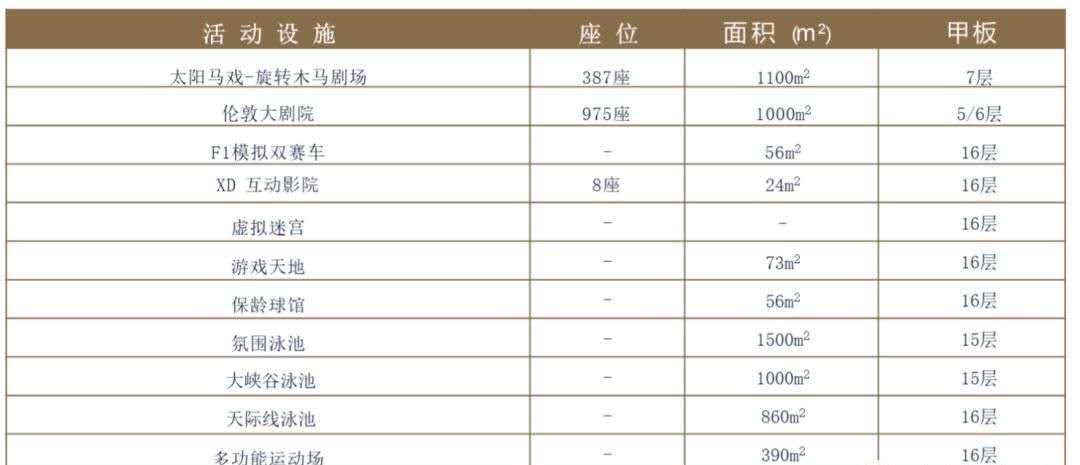 在意大利知名兒童品牌智高(CHICCO)細心安全的設施和目不暇接的可愛玩具中,3 歲以下的寶 寶盡情探索童真的小宇宙;3-11 歲的寶貝能再繽紛的樂高(LEGO)海上樂園中組裝自己的海上城堡,12-17 歲的青少年更設有各種球類運動兼容的多功能運動場、82 米喜馬拉雅滑水道和 F1 模擬 賽車等,讓青春期的小大人在高端安全的空間中自在冒險。