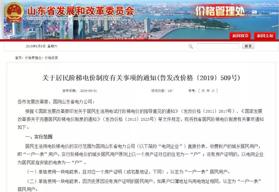 省發改委發布了《關于居民階梯電價制度有關事項的通知》(魯發改價格〔2019〕509號)