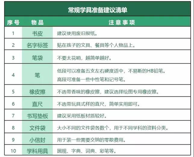 開學(xué)前,家長可以幫助低段的孩子共同討論一個(gè)學(xué)具準(zhǔn)備清單,高段的孩子可以自主準(zhǔn)備。給家長們提供了一份清單,僅供參考。