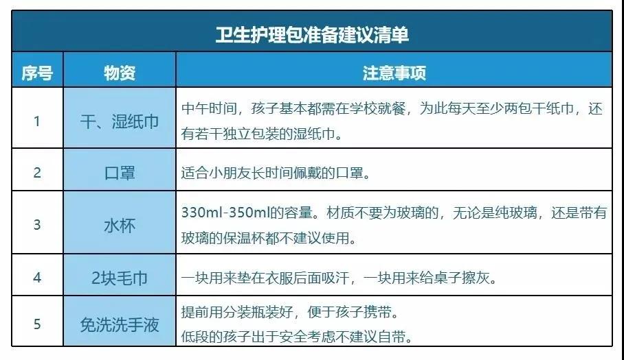 除了學(xué)具的準(zhǔn)備外,家長可以跟孩子做好疫情期間的抗疫物品準(zhǔn)備。比如,可以準(zhǔn)備個(gè)衛(wèi)生護(hù)理包,護(hù)理包里準(zhǔn)備兩個(gè)口罩,一些濕紙巾,兩包干紙巾,條件允許的話還可以準(zhǔn)備免洗的洗手液或者消毒液,或者一次性的小方巾。
