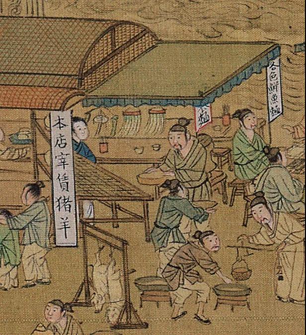 賣生魚的魚行也流動(dòng)經(jīng)營(yíng),“賣生魚則用淺抱桶,以柳葉間串清水中浸,或循街出賣,毎日早惟新鄭門、西水門、萬勝門,如此生魚有數(shù)千檐入門。冬月即黃河諸遠(yuǎn)處客魚來,謂之‘車魚’,毎斤不上一百文。”價(jià)廉物美的流動(dòng)魚販極大的便利了人民生活。《水滸傳》里,楊志賣刀,武大郎賣炊餅,都情同流動(dòng)攤販,也不交稅。