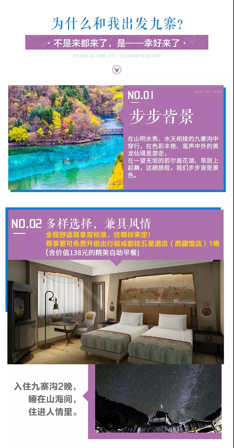 4、九寨溝景區實行分區域開放,開放區域為溝口經諾日朗瀑布至長海,扎如溝的扎如寺及日則溝的鏡海;其中,長海、五彩池、鏡海、諾日朗瀑布、樹正群海、雙龍海瀑布、扎如寺等景觀原則上為步行游覽區,具體游覽方式請聽從隨車講解員安排;