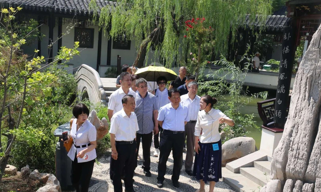 在檢查調研過程中,杜秘書長一行邊實地檢查調研,邊聽取介紹,并不時詢問了解相關情況,對宛園突出文化靈魂,精造旅游載體的做法給予高度評價,他們認為:“宛園”是一家“江南古建,水鄉風格”的蘇式園林。它匯集眾家名園精華,布局精巧,疏密得當、移步易景、曲徑通幽;磚雕、木雕、泥雕、青磚灰瓦、奇石遍布,盡顯靈秀氣息;契合了“山水詩、山水畫、山水園”相融合的意境,完美地實現了“千景匯集小天地,千幅圖畫在園中”的藝術效果。中國運河名揚天下,宛園美景享譽四方。同時,他們高屋建瓴,指出了園林建設中,不被人們意識的瑕疵,提出了頗有見地的指導意見和極具針對性的建設性建議。這些意見和建議對“宛園”的進一步提高、完善和發展將起到積極的推動作用。