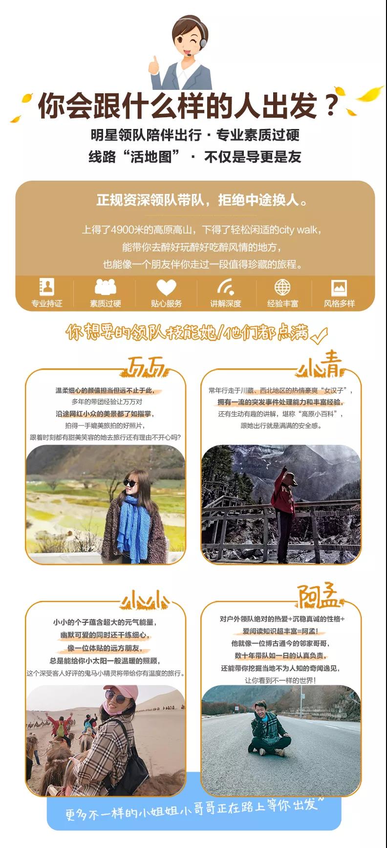 私人訂制:我們業(yè)務(wù)范圍囊括了全國各大城市,川西、西北、東北,在路上永遠(yuǎn)有我們的身影。我們將為每一個有定制需求的你策劃出獨屬于自己的完美旅行。