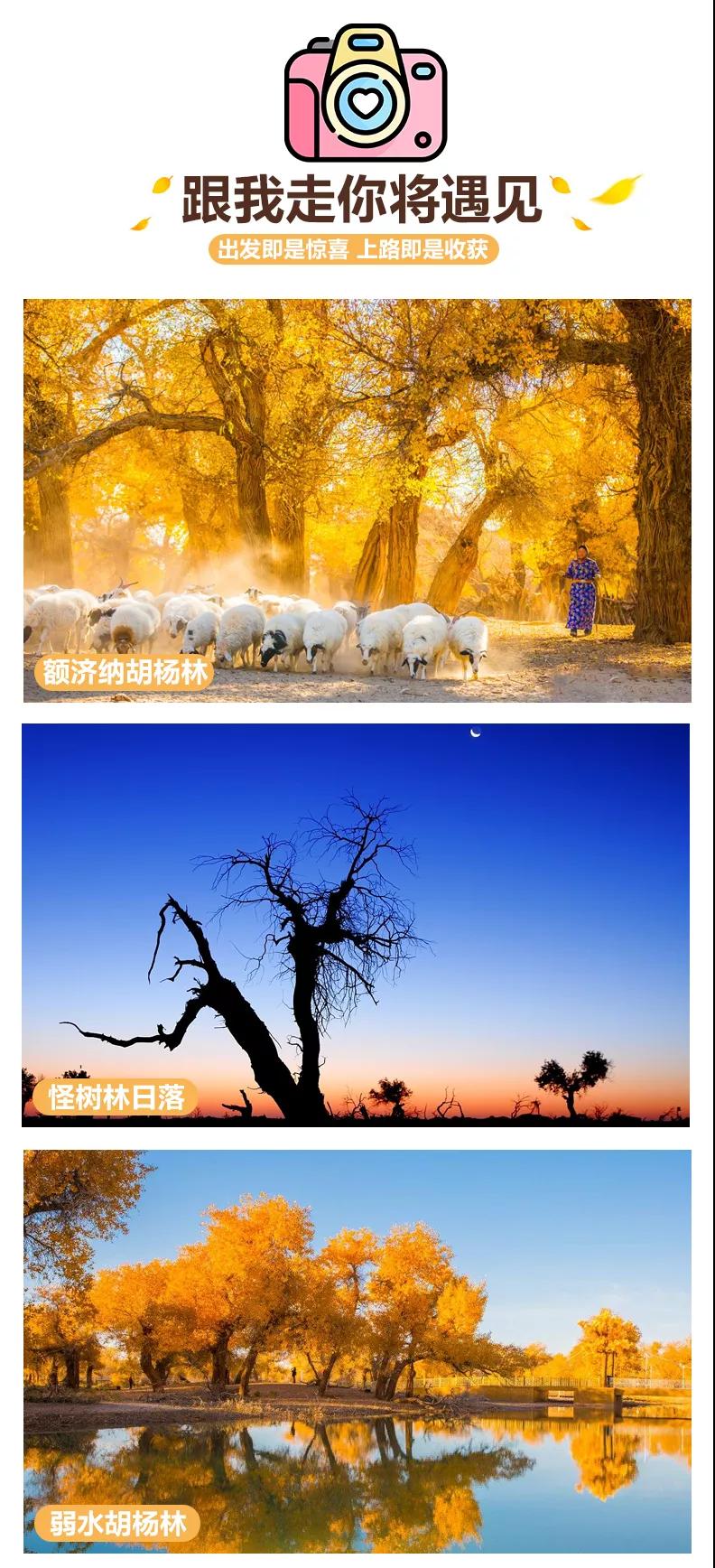 隨后我們在【額濟(jì)納胡楊林景區(qū)】中自行游玩攝影創(chuàng)作,胡楊有“生而一千年不死,死而一千年不倒,倒而一千年不朽”的說法,被世人稱為英雄樹。千姿百態(tài)的胡楊遍布在沙漠中,漫步輝煌的金秋胡楊林,用鏡頭記錄這中國最美的秋景;或者去找尋導(dǎo)游所說的一樹三葉的神奇景象——“幼樹葉如針?biāo)屏肌妖g樹葉酷似白樺、老年樹葉橢圓”,胡楊、藍(lán)天、來自大漠腹地的風(fēng)聲襲來之時,胡楊林便泛起黃澄澄的層層漣漪,顯盡大西北秋冬那紅盛翠減的獨有風(fēng)情。張藝謀的大片《英雄》中張曼玉與章子怡身著紅衣在這漫天的金色胡楊中打斗,踱步在胡楊林,熒屏內(nèi)的唯美畫面一一浮現(xiàn)。