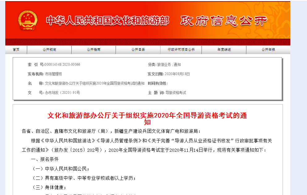 文化和旅游部辦公廳關(guān)于組織實(shí)施2020年全國導(dǎo)游資格考試的通知