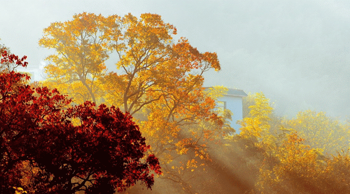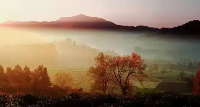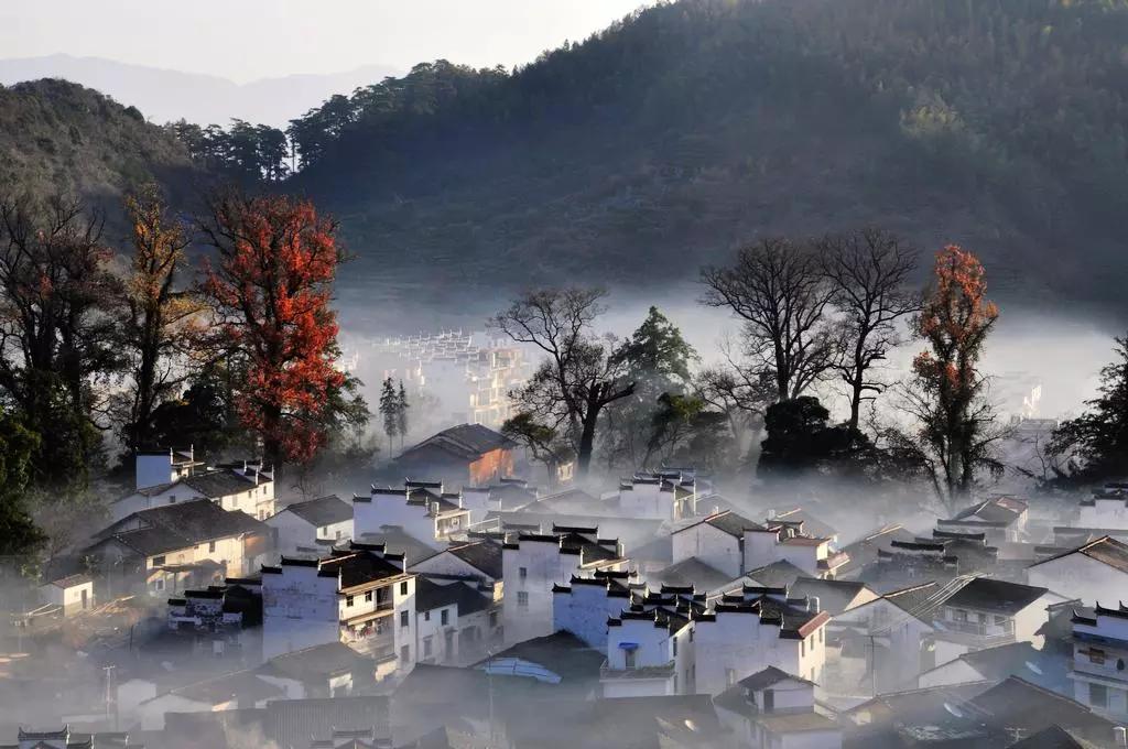 塔川烏桕樹經過霜降,由綠變黃,由黃變紅,漸變出調色板般豐富的色彩。塔川的清晨極美,薄薄的霧氣似有似無,籠罩在山腰,林間,農家的小屋若隱若現,紅楓叢中小露飛檐翹角,黃葉微隙掩映粉墻黛瓦,如中國山水畫般詩情畫意。