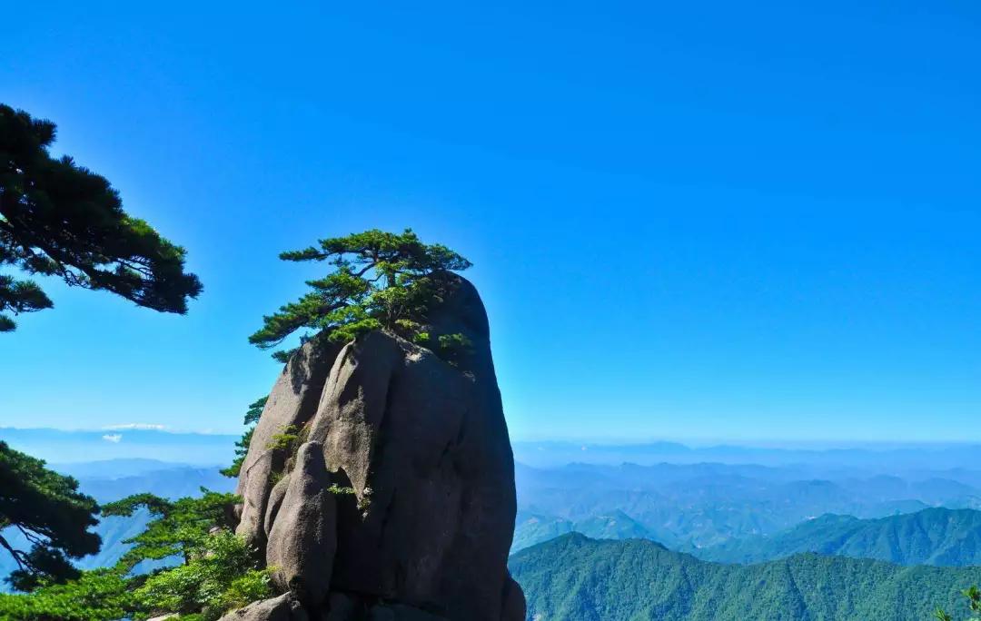 仰望天空,黃山的天湛藍如洗,入了秋更顯得高遠,空曠無邊、萬里無云,更無一絲雜質,像一塊覆蓋大地的藍寶石。