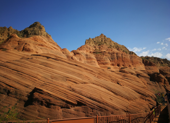 早餐后乘車約2.5小時150公里赴波浪谷景區走進被譽為中國最美的【波浪谷】自理項目電瓶車50元,一起去感受大自然的鬼斧神工。龍洲紅砂巖位于靖邊縣龍州鄉,是由紅色的砂巖構成的特殊丹霞地貌,在長期的風力和雨水的沖刷下形成溝壑、波浪起伏的山丘狀,因砂巖上的紋路像波浪,人稱“波浪谷”。遠遠望去,這些紅色石頭就像泥石流一樣呈現出一種流水狀,一圈圈、一彎彎的向溝壑中涌去,好像滔滔的黃河,洶涌奔騰,也有人把這里譽為”中國的科羅拉多”。靖邊波浪谷巖石學術上被稱為“砒砂巖”,成于古生代二疊紀和中生代三疊紀、侏羅紀、白堊紀之間。這是地球歷史中地質最活躍、生物最繁茂、動物最龐大的時代。砒砂巖像綻放的罌粟花般美麗,壯觀,誘人,無水堅硬如石,遇水松軟如泥。