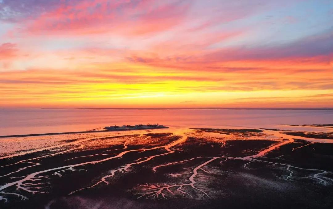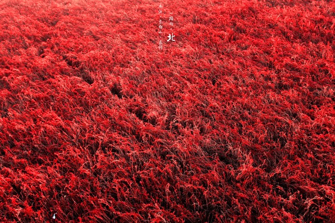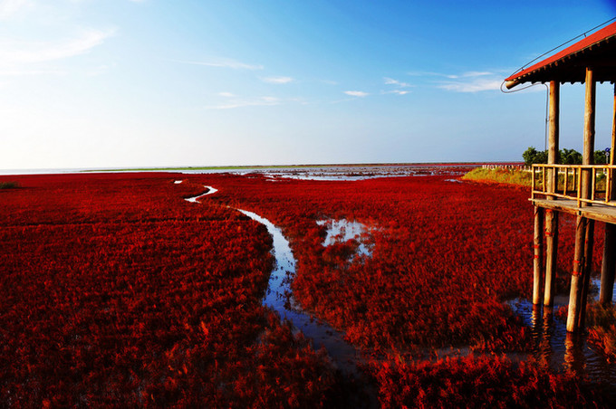 紅海灘位于遼寧省盤(pán)錦市渤海灣的東北部,地處遼河三角洲濕地內(nèi),是國(guó)家級(jí)自然保護(hù)區(qū)。這里的海灘之所以呈現(xiàn)出紅色,其實(shí)是因?yàn)楹┥仙L(zhǎng)堿蓬草是一種可以在鹽堿土質(zhì)上存活的草。每年四月,堿蓬草長(zhǎng)出地面,初為嫩紅,漸次轉(zhuǎn)深,秋季由紅變紫。堿蓬草不要撒種,無(wú)須耕耘,在鹽堿鹵漬里,年復(fù)一年地生長(zhǎng),造就了這一奇觀。盤(pán)錦的紅海灘每年以50米的速度向大海延伸,始終追趕著海浪的蹤跡。
