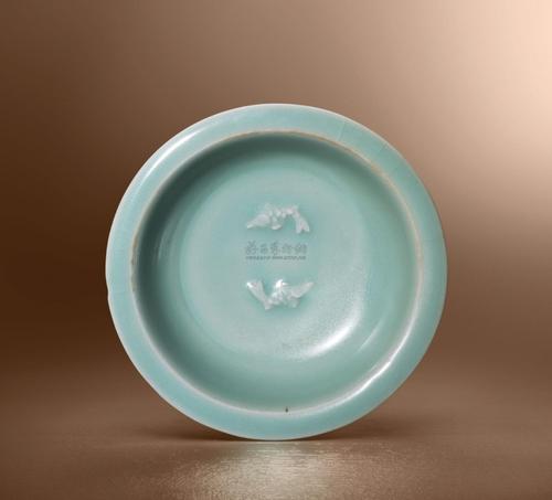 粉青色正是鐵還原的標準色。由于釉藥下注,往往在轉折部分釉藥較薄,露出白色胎骨,成一條白線,即就是所謂的“出筋”;這種出筋,也往往出現在凸雕的花紋上。弟窯還有翠青色,濃淡不一;豆綠色,顏色與汝窯器大致相同,往往不易分辨。
