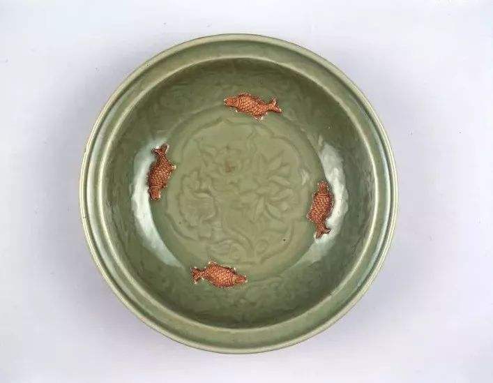 此洗敞口,折沿,圈足。洗心內塑貼兩條游魚,外壁刻凸菊瓣紋一周。口沿兩側各有兩個穿孔,相互對應,可用于穿飾金屬提環,以便于提攜。此器釉色青翠,塑貼魚紋清晰,是南宋龍泉窯的典型作品。在韓國新安海底沉船中亦發現有類似器物。