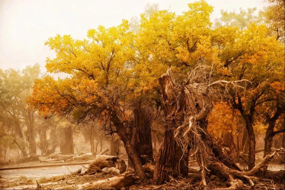 一場秋雨一場寒,當白樺林的葉子漸漸凋零,那沙漠里的胡楊林,卻在凄美的風中綻放著金黃的色彩,展現(xiàn)著它的不屈與壯美。