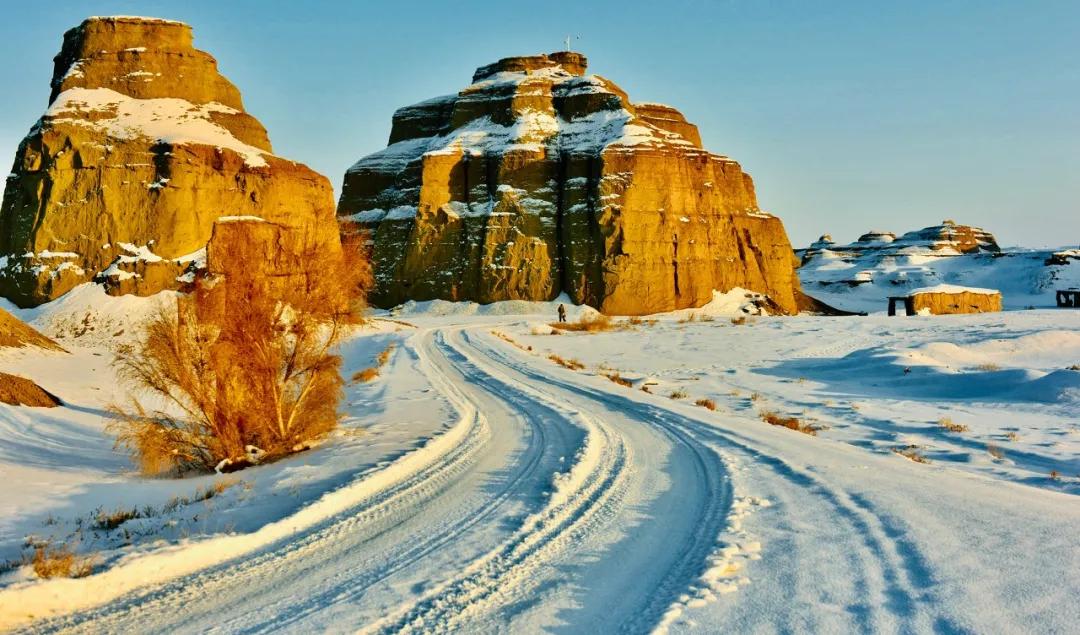 在冬季的魔鬼城,披上了一層雪白的外衣,原本的詭譎多了幾分柔和之美。
