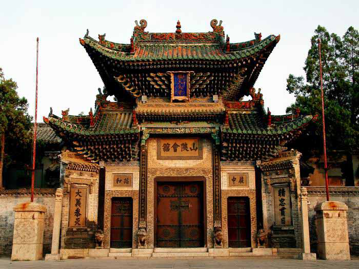 山陜會(huì)館的大門(mén)是三間牌坊式門(mén)樓,上方懸掛的豎匾“協(xié)天大帝”,是說(shuō)關(guān)公是協(xié)助上天統(tǒng)御萬(wàn)眾的神。下方的木質(zhì)浮雕垂花門(mén)罩,雕刻著白象、版權(quán)所有聊城聊之旅旅行社有限公司,轉(zhuǎn)載必究!駱駝、麒麟等佛教吉獸和托塔天王李靖等佛教天王。大門(mén)高3米,寬2.3米,兩側(cè)的對(duì)聯(lián)是歌頌關(guān)公的,“本是豪杰作為,只此心無(wú)愧圣賢,洵足配東國(guó)夫子;何必仙佛功德,唯其氣充塞天地,早已成西方至人。”意思是說(shuō):關(guān)公的所作所為己經(jīng)是一位豪杰了,而他的思想和品德就算和圣賢相比,也是無(wú)愧的,足可以和東方魯國(guó)的孔夫子相媲美;您何必修仙拜佛呢,關(guān)公并沒(méi)有那樣做,但他的浩然正氣卻能夠充塞于天地之間,早已成為最完美的人了。對(duì)聯(lián)將關(guān)羽的地位放在頂點(diǎn),以和孔子相匹配,體現(xiàn)出濃郁的地方特色。兩邊的小門(mén)上方各有石刻匾額一方,體現(xiàn)出儒家思想的中庸之道:“履中”是說(shuō)做人應(yīng)該行為中正;“蹈和”是講接人待物應(yīng)該和氣,在這里也可以體現(xiàn)出商人講究和氣生財(cái)?shù)奶幨勒軐W(xué)。