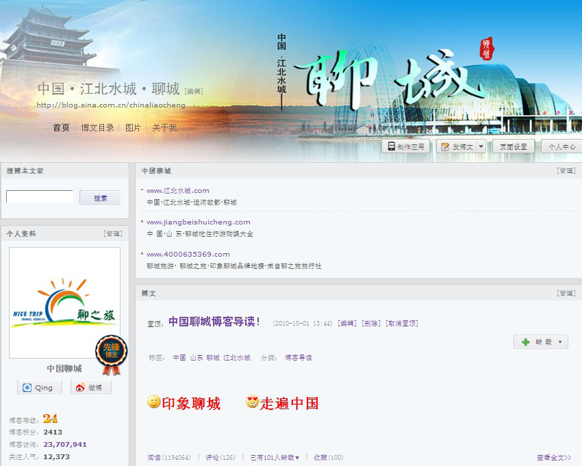 中國聊城 http://blog.sina.com.cn/chinaliaocheng 于2010年3月份注冊,共有博文2251篇,其中被新浪博客首頁推薦45篇,目前中國聊城新浪博客訪問量達23,707,953次,關注12373人次。