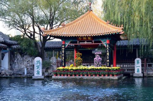 請(qǐng)大家跟我來。趵突泉公園位于濟(jì)南市中心,南靠千佛山,東臨泉城廣場,北望大明湖,面積近11萬平方米。趵突泉公園是一座以泉水為主的自然山水公園,其內(nèi)趵突泉又名檻(jian,kan)泉,為濼(luo)水之源,是濟(jì)南七十二名泉之冠,被譽(yù)為“天下第一泉”,至今已有2700年的歷史,水溫一年四季恒定在攝氏18度左右。趵突泉公園以觀泉、賞魚、品茶、山石文化為特色,以小巧玲瓏、步移景異、清潔幽靜、古樸典雅而著稱。