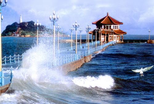 大家隨我來。這具有代表性的宏偉建筑為何稱作棧橋呢?關于棧橋的定義,漢語字典中的解釋是:“凡是伸到海里的簡易碼頭都稱為棧橋。”那它為什么又會成為青島的標志呢?原來青島在100多年前是一個小漁村,1891年清政府下詔書在青島建置。1892年清政府派登州總兵章高元帶四營官兵駐扎青島,為便于部隊軍需物資的運輸,建了兩座碼頭,一座就是現(xiàn)今的棧橋。另一座是位于總兵衙門前方的“衙門橋”,亦稱“蝸牛橋”。這兩座碼頭都是中國工程師自己設計的,也是青島港最早的碼頭建設。1897年,德軍以演習為名,從青島灣登陸,武力占領青島,棧橋成為德軍侵占青島的見證。德侵占青島后,將原橋北端改為石基,水泥鋪面,南端下立,鋼制橋架上面鋪有木板,并設輕便鐵軌,南端仍是鐵木橋,橋身延長到350米,仍為軍用碼頭。1904年大港第一碼頭建成后,棧橋逐漸失去它作為碼頭的歷史使命,開始向游人開放。1911年青島被中國收回,1931年國民政府出巨資由德國信利洋行承包重建,橋身加長到440米,橋南端增建了半圓型的防浪堤,并在防浪堤上修建了具有民族形式的二層八角涼亭,亭子由彩色琉璃瓦覆蓋,24根紅漆柱子支撐,取名“回瀾閣”。閣心有螺旋形樓梯,樓上一周為玻璃窗,有“一窗一景,一景一畫”之說。整個工程至1933年4月竣工。 棧橋從此成為青島第一景。建國后,人民政府多次撥款對棧橋進行維修,不僅達到防風浪、防腐蝕的要求,還在原有風韻的基礎上增加其美觀性使整個橋體煥發(fā)出青春。
