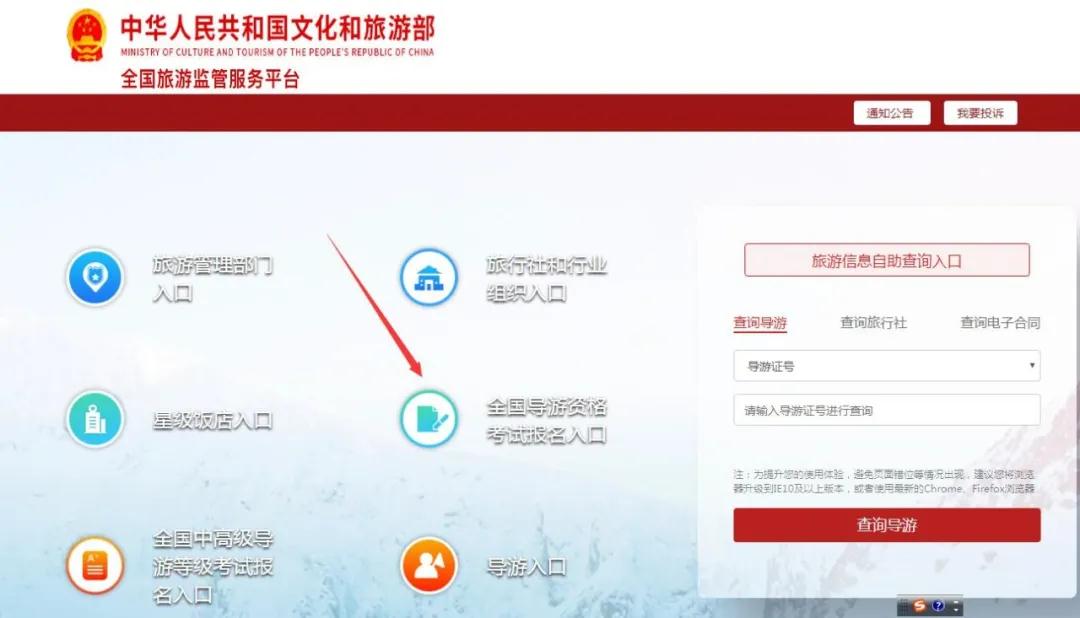 (進入“全國旅游監督服務平臺”,選擇“全國導游資格考試報考入口”入口登錄)