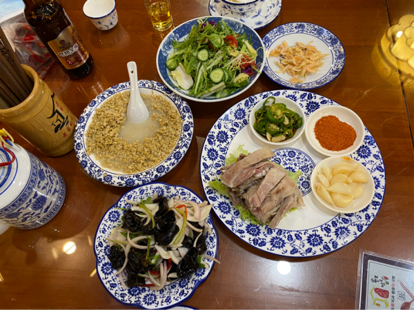 游覽結(jié)束,回到天水市區(qū)入住。想吃當?shù)靥厣业搅恕袄霞野舜笸搿苯鉀Q晚飯,非常滿意,手抓羊肉、甜胚子、大拌菜,有滋有味。此時還不知道接下來面臨什么樣的美食荒漠。當?shù)氐臋烟乙脖容^有名便宜,路上買了一點。