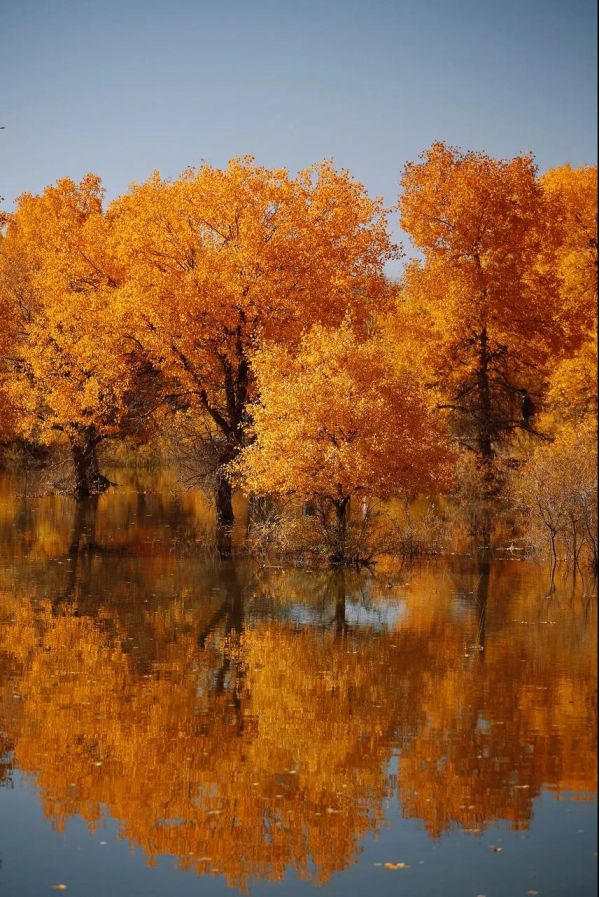 她雖身處于中國流動最大的塔克拉瑪干沙漠,但依舊樂觀。用耀眼、跳躍的金黃點綴了滿目荒蕪的漠黃。 她雖然身處沙漠,心中卻似乎向往水鄉。因為這兒,有著涓涓河流,金黃潑在兩岸,身影倒映水中。
