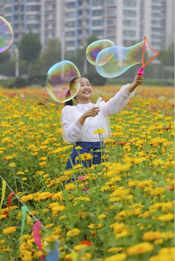 花海中可以看到向日葵、波斯菊、一串紅、步步高、格?;ā囮囄L拂過,散發(fā)著淡淡的清香。