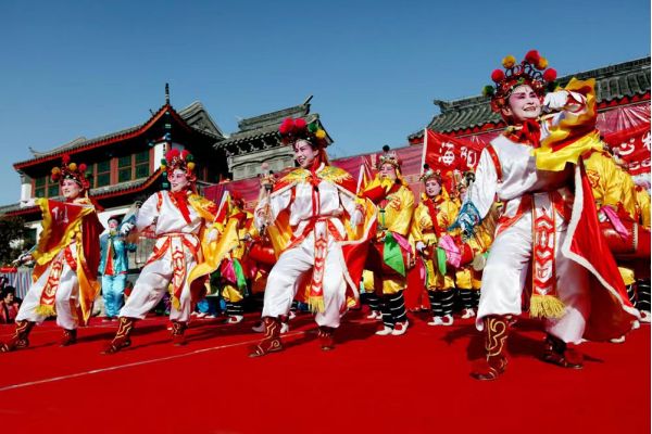 正月十五不進城,過日來了攆出城。”說明秧歌當時已成為慶賀節(jié)日不可少的活動內(nèi)容,而鳳城已是四鄉(xiāng)秧歌的活動中心。海陽秧歌得以逐步發(fā)展、日趨成熟,重要因素之一是它能不斷地吸收各種外來藝術(shù)的精華,如乾隆三十五年海陽柳樹莊人陳英弼編寫的秧歌劇《陳老喜勸子跑四川》序中所述:“余隨胡公廷章供職邛州,甚愛蜀歌之美,仿做'跑四川'。教秧歌班演唱”。由此可見,早在二百多年前,海陽秧歌的音樂唱腔就已經(jīng)借鑒蜀歌了。另外,海陽秧歌中"樂大夫"俗有“螳螂門”、“八卦門”之分,即是指他的舞蹈基本動作汲取了不同拳術(shù)套路而形成各自的風格。