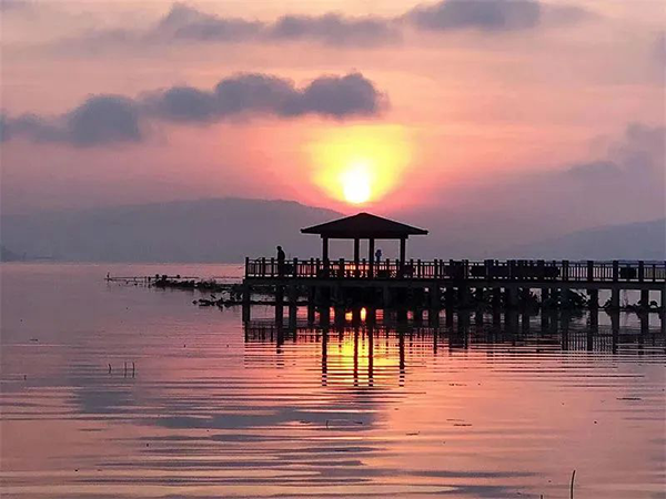 冬天的石屏異龍湖,不僅有從西伯利亞遠渡重洋而來的紅嘴鷗,還有“半江瑟瑟半江紅”的詩畫風光。