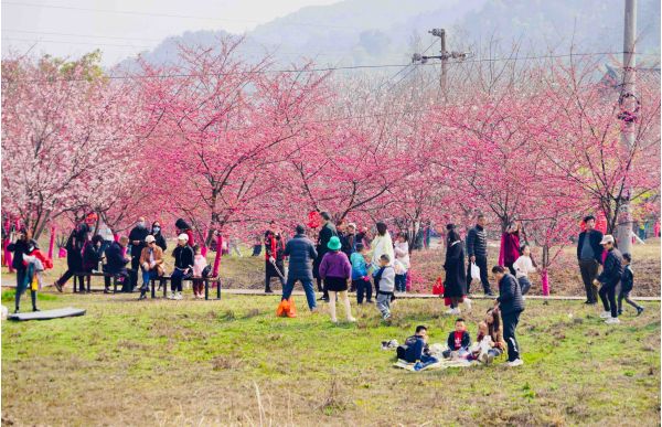 2月26日,恰逢周末,在湘潭市岳塘區昭山鎮七星村,近三百畝的櫻花園里,“香妃櫻”“中國紅”“香水櫻”“牡丹櫻”“紅粉佳人”等品種的櫻花,紅似火、粉如霞,共同形成了一片浪漫的花海,游人在櫻花樹下打卡拍照,盡情享受融融春日的歡樂。