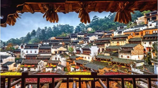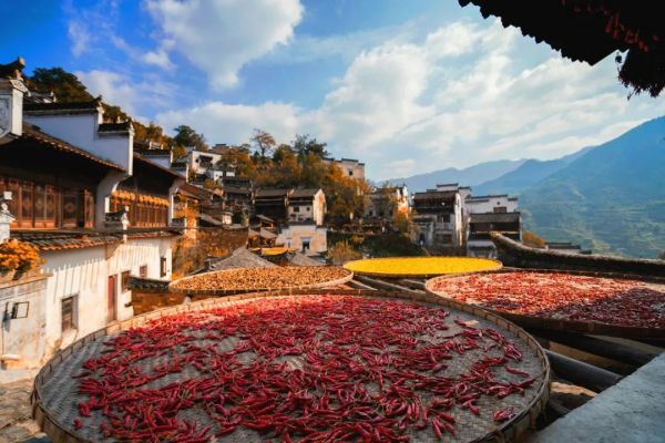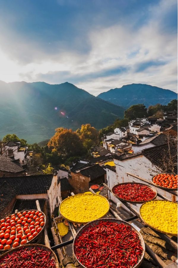 每到豐收時節(jié),陽光下數百棟錯落的徽派民居,和曬架上五彩繽紛的豐收成果構成絢爛的“曬秋”景觀。