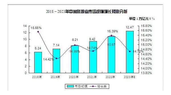 2023年中國旅游市場高速增長,入出境市場平穩(wěn)發(fā)展,供給側結構性改革成效明顯。從2012-2017年旅游行業(yè)數(shù)據來看,全國旅游收入保持著兩位數(shù)穩(wěn)定增長。2014年全國旅游收入達3.73萬億元,同比增長25.4%,達到近幾年來增速峰值,2015年增幅相對有所放緩。隨著近年來,政府大力發(fā)展全域旅游、冰雪旅游等,2015-2017年中國旅游業(yè)收入增速不斷提高。2018年全國旅游收入將達6.24萬億元,增速約增至15.6%,2023-2028年中國旅游行業(yè)市場深度研究及發(fā)展前景投資可行性分析報告預計到2023年全國旅游收入將達到12.47萬億元 ?