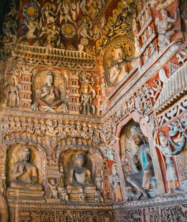 云岡石窟依山而鑿,浮雕飛天,生動(dòng)活潑。