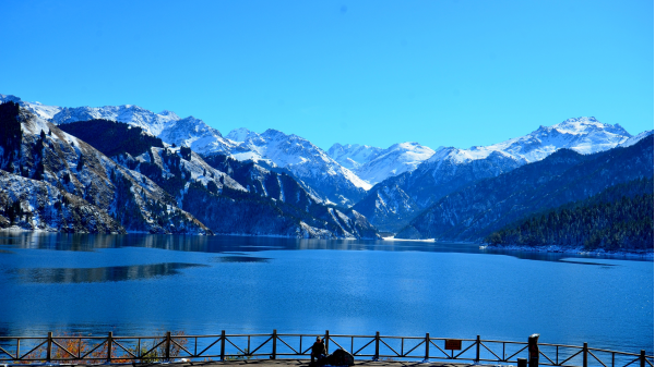 天池位于新疆阜康市境內(nèi)的博格達(dá)峰下的半山腰,東距烏魯木齊110公里,海拔1980米,是一個(gè)天然的高山湖泊。湖面呈半月形,長3400米,最寬處約1500米,面積4.9平方公里,最深處約105米。湖水清澈,晶瑩如玉。四周群山環(huán)抱,綠草如茵,野花似錦。有“天山明珠”盛譽(yù)。挺拔、蒼翠的云杉、塔松,漫山遍嶺,遮天蔽日,十分美麗。