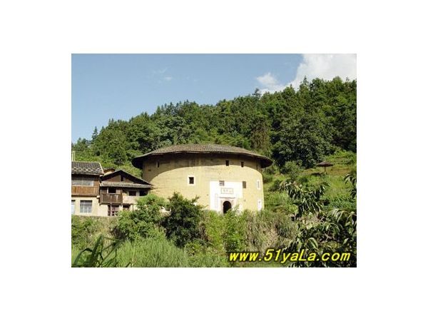永定土樓分方形土樓和圓形土樓。永定全縣有圓樓360座,方樓4000余座。圓形土樓(又稱圓寨)是客家民居的典范,圓樓大都由二、三圈組成, 由內到外,環環相套。外圈高十余米,一般高三至四層,有一、二百個房間。一層是廚房和餐房,二層是倉庫,三、四層是臥室;二圈兩層,有三十至五十個房間,一般是客房。中間是祖堂,是居住在樓里幾百人婚喪喜慶的公共場所。樓內還有水井、浴室、磨房等設施。土樓采用當地生土夯筑,不需絲毫鋼筋水泥,墻的基礎寬達三米,可行汽車,底層墻厚1.5米可橫臥人,向上依次縮小,頂層墻厚也不小于0.9米。沿圓形墻用木板分割成眾多的房間,其內側為走廊。