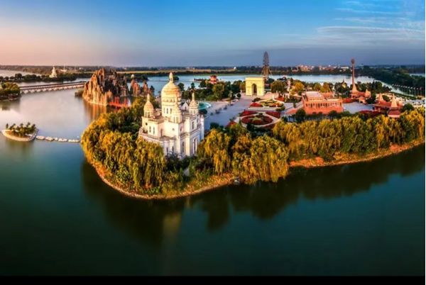 “世界風光”微縮了世界名建筑希臘宙斯神廟、 法國雄獅凱旋門、德國柏林眾議院、荷蘭風車、巴黎圣心教堂、北海白塔等。有天鵝湖、九曲橋、玉帶橋、湖心書畫長廊、柳堤等景點。