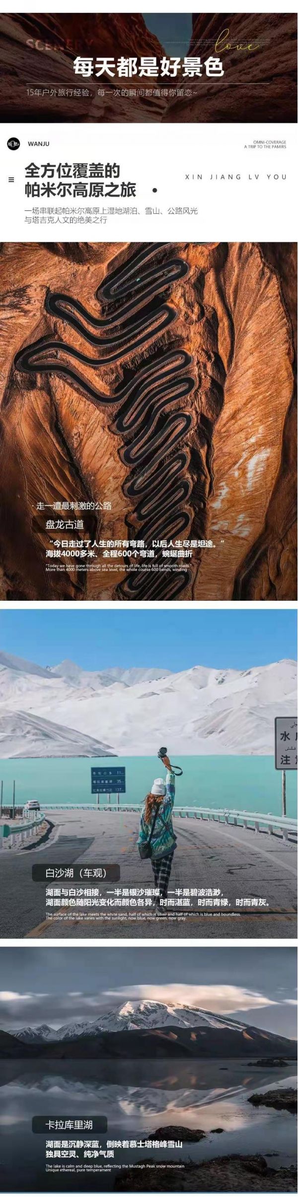 告別“東方摩洛哥”—喀什,我們將開啟一段帕米爾高原之旅。沿314國道一路暢游帕米爾高原風光,首先驚艷我們的是背靠白色沙丘和雪山的【白沙湖】,在陽光的變化下,湖水時而呈湛藍色,時而呈綠色。更令人驚嘆的是,藍色的湖面與白沙相接,一半藍一半白,而白沙背后還有雪山。在雪山和白沙的映襯之下,白沙湖水更顯澄澈。在這里能get湖泊、白沙、雪山同框的畫面。分享一個冷知識:白沙湖又名流沙河,就是西游記里唐僧收服沙和尚的地方。我們還能途觀慕士塔格峰,山頂常年皚皚白雪,猶如滿頭白發(fā),十余條冰川鑲嵌在峰體下的峽谷中,如胸前飄動的銀須,故有“冰山之父”的美稱。隨后我們將遇見【卡拉庫里湖】,這里能看到雪山倒映在湖面的風景,拍出來的照片特別的給人純凈的感覺。