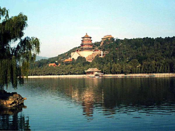 頤和園擁山抱水,絢麗多姿。濃綠的萬壽山,聳立在昆明湖的北畔。在一片湖光山色之間,點(diǎn)綴著許多殿堂、樓、閣、廊、榭、亭、橋等精美的建筑。這些建筑是風(fēng)格各具特色。全園布局可分為政治活動(dòng)區(qū)、生活居住區(qū)和風(fēng)景游覽區(qū)。進(jìn)入頤和園的大門(東宮門),迎面就是以仁壽殿為主體的政治活動(dòng)區(qū)。仁壽殿前庭寬闊,松柏蒼翠,奇石假山點(diǎn)綴其間。階前陳列著古銅寶鼎和龍鳳。院內(nèi)石須座上蹲著一只銅怪獸,是傳說中的麒麟。在清代,這里是慈禧和光緒朝會(huì)大臣的地方。現(xiàn)在殿里仍照當(dāng)年帝后臨朝的原狀布置著。仁壽殿南北兩側(cè)的配殿和仁壽門外的南北群房,是六部九卿的值房。