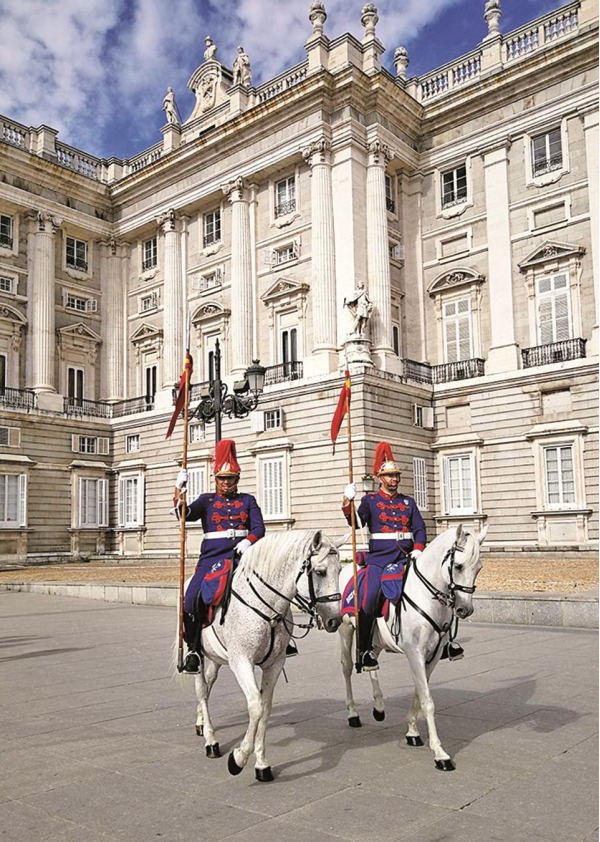 據(jù)導(dǎo)游介紹,西班牙馬德里皇宮建造設(shè)計參考了巴黎盧浮宮的草圖,王宮內(nèi)部每個房間都各具特色?;蕦m里面藏有不少珍寶級的繪畫、瓷器及其他皇室用品。現(xiàn)在西班牙皇宮已被辟為博物院,雖然皇宮仍然是官方的皇室駐地,但國王并不居住在此,只是偶爾來這里辦公,如果有幸看到皇宮屋頂?shù)膬擅嫫鞄猛瑫r升起,那就表明國王恰好到這里辦公。