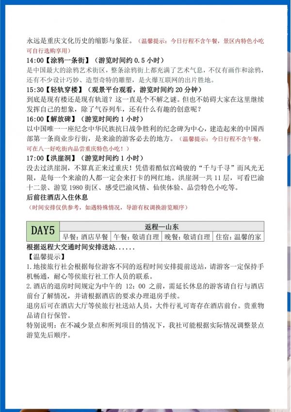 重慶雙飛5日游 聊城發(fā)團 純玩 無購物 重慶奧陶紀題公園 統(tǒng)景風景區(qū) 民國街 黃桷坪涂鴉街 中山四路 洪崖洞 磁器口 輕軌穿樓 ...... 發(fā)團日期 2023061620230621 價格 3990 報名電話 0635 8681234