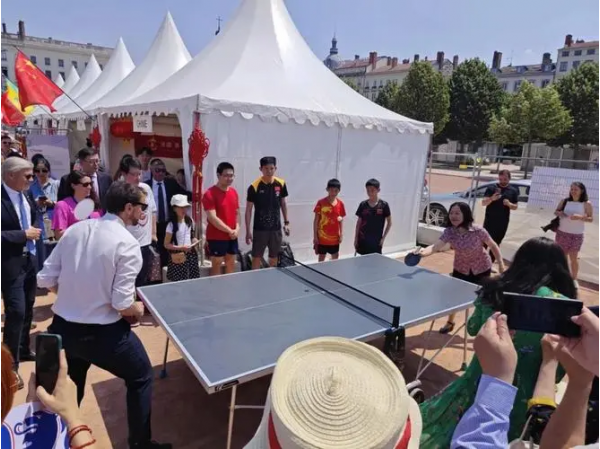 陸青江總領事陪同里昂市長杜塞、副市長茲多羅夫佐夫等來賓參觀中國展棚,法國小熊貓學校鄧翔教練帶領小熊貓乒乓球隊的三位省級冠軍球員陳玉麒、陳玉麟和柯弘毅組成“小熊貓乒乓天團”,現場做了精彩表演,并和市長及總領事進行乒乓球對打練習。隨后,杜塞市長還興致勃勃的同陸總領事打起乒乓,并表示充分感受到中華文化的博大精深和中華體育之美。