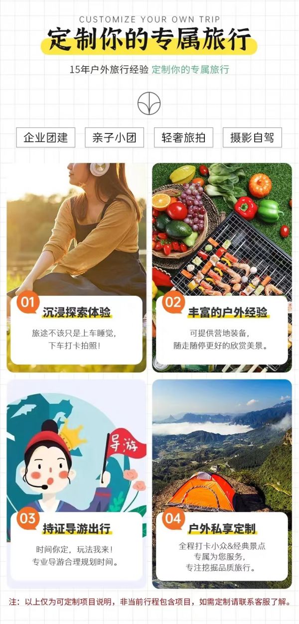 私人訂制:我們業務范圍囊括了全國各大城市,川西、西北、新疆,在路上永遠有我們的身影。我們將為每一個有定制需求的你策劃出獨屬于自己的完美旅行。
