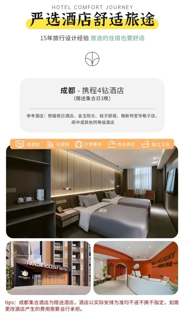 住宿:含全程4晚舒適酒店。(tips:成都集合酒店為贈送酒店,酒店以實際安排為準均不換不退不指定,如要更改酒店產生的費用需要自行承擔。)