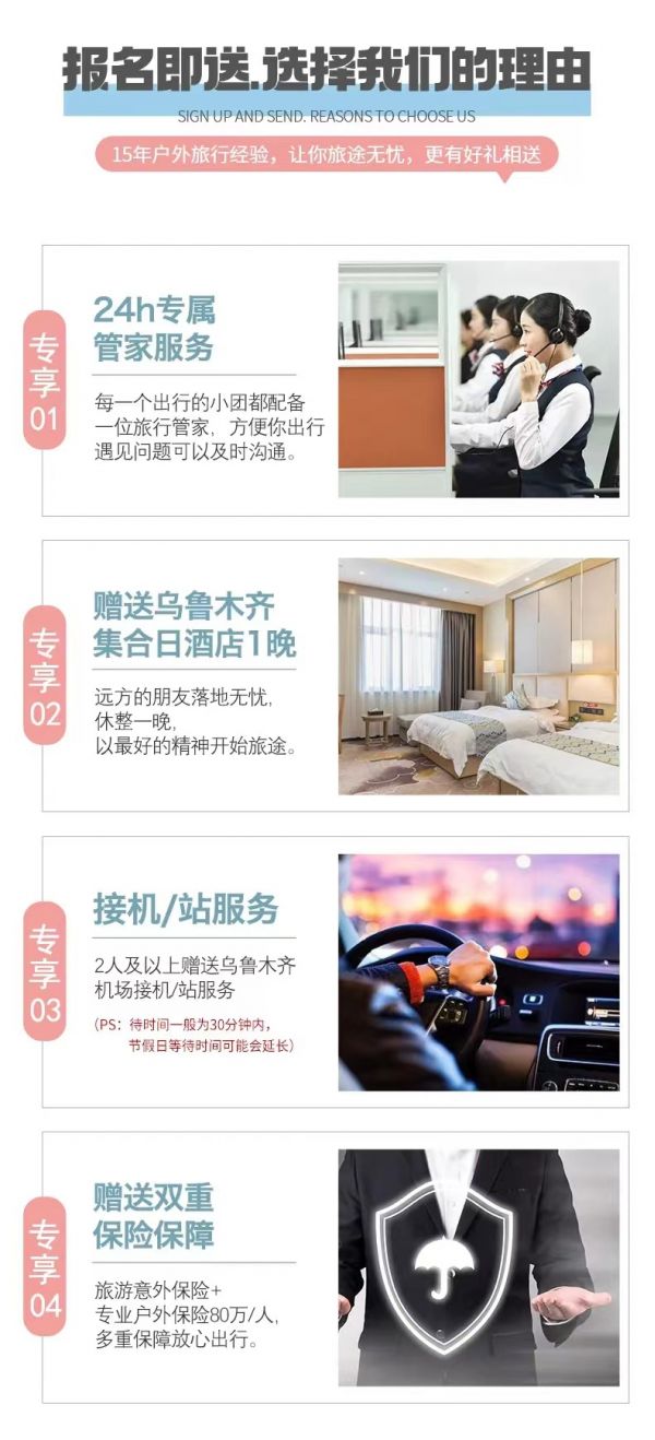 接站服務:本次活動提供烏魯木齊24小時接機/接站服務,工作人員會在您出發日期前一天21:30之前向您推送消息并與您聯系,如果超過時間沒有接到任何通知,請及時與報名處聯系。(接站等待時間一般為15-20分鐘,最長不超30分鐘,節假日拼單人數較多情況下客人等待時間可能會延長)。