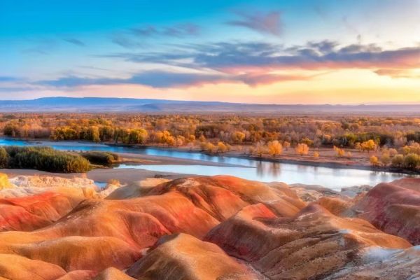 在夕陽西下時候,前往【五彩灘】外圍游覽,這里是額爾齊斯河的一段特殊的河灘,南岸是蔥郁的樹木和草地,北岸則是寸草不生的土地,一河兩岸,各有洞天。這里的土丘擁有豐富的地貌色彩,被稱為上帝打翻的調色板,尤其是天氣晴好夕陽西下時分,進入景區后看到余暉灑在河岸邊的丘陵,顏色瑰麗令人炫目。穿行在土地的溝壑之中,兩側的土壤或呈灰褐色,或呈金黃色,還可以登上觀景臺,俯瞰整個景區帶給眼睛的色彩沖擊,舉起相機拍出你想要的大片。來到布爾津一定要去熱鬧的河堤夜市逛一逛,品嘗這里特產的烤魚,配上一杯香甜的格瓦斯,一掃當日的旅途辛勞。】