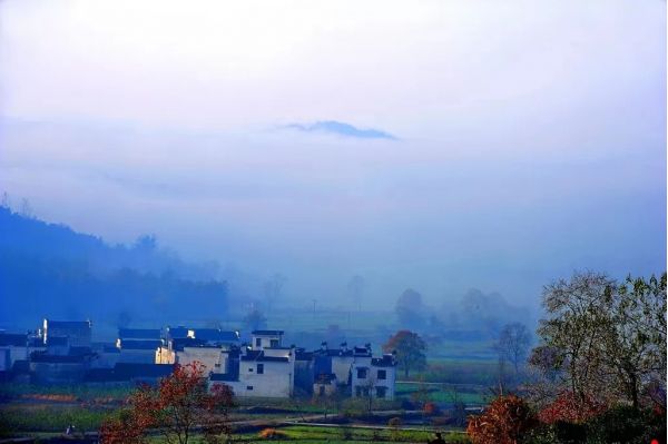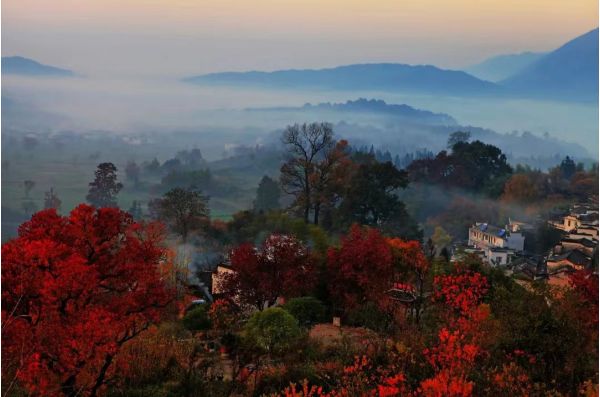 塔川烏桕樹經過霜降,由綠變黃,由黃變紅,漸變出調色板般豐富的色彩。塔川的清晨極美,薄薄的霧氣似有似無,籠罩在山腰,林間,農家的小屋若隱若現,紅楓叢中小露飛檐翹角,黃葉微隙掩映粉墻黛瓦,如中國山水畫般詩情畫意。